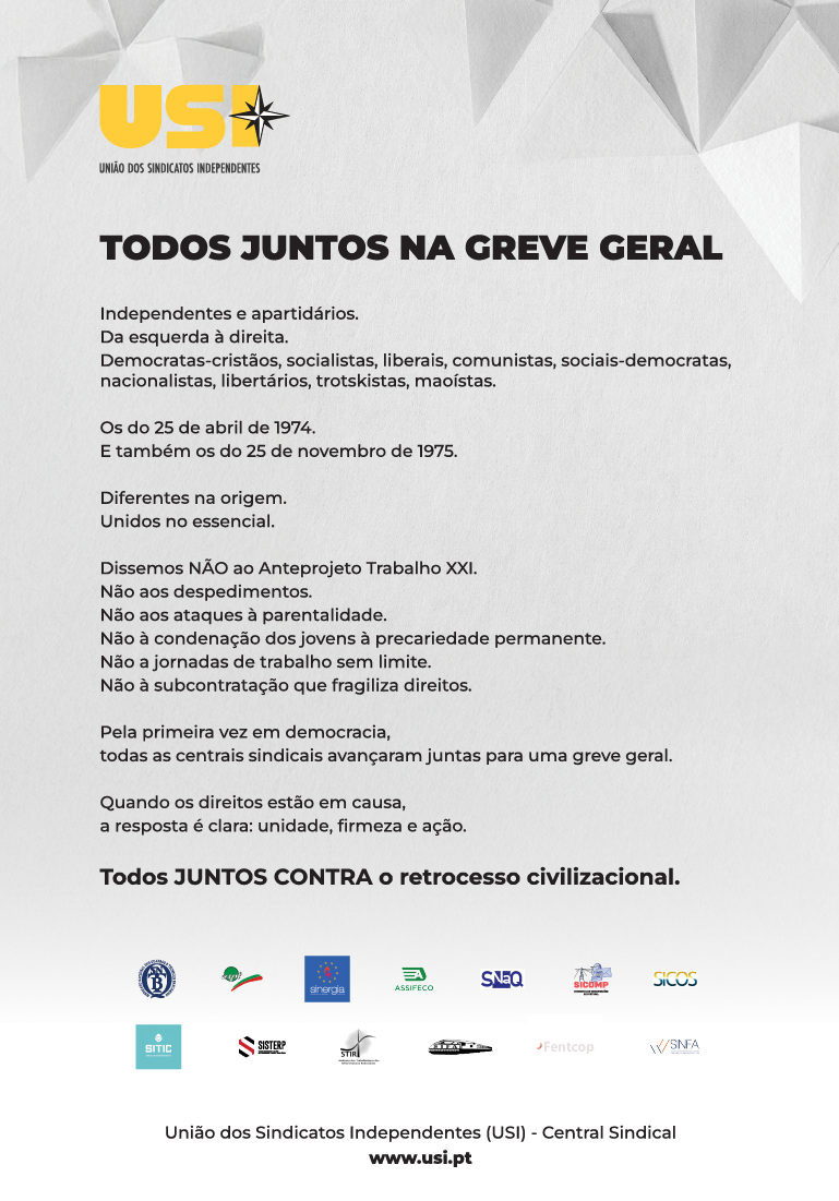 União dos Sindicatos Independentes (USI) pré-aviso de greve geral para 11 de dezembro de 2025